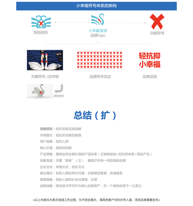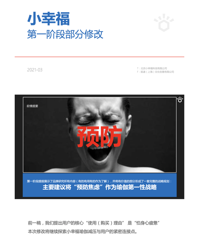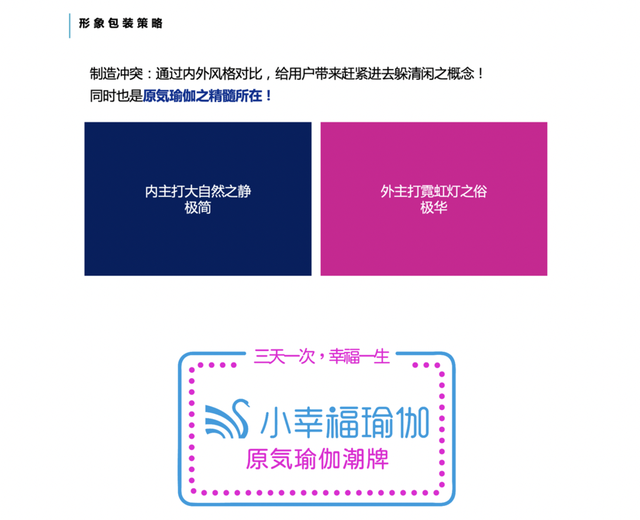 服务经过:2021年伊始,小幸福瑜伽欲在发力市场拓展及广告投放之前,首先规划好自己的品牌体系。因此,寻找一家第三方品牌咨询公司作为外脑进行意见参考,在品牌工作上给一些第三方的梳理和建议,于是找到了“观速”,双方顺利就全案项目合作金额和合作方式达成一致,并签约执行。经过近40余天的品牌调研及策划工作,观速3.1日前往北京进行提案,后进行了相应的修改。现观速在严格遵守《民法典》前提下,在自己有限权利内使用合同中“六-1 知识产权的保护”中的“对成果有在媒体(包括自有媒体)冠名宣传的权利”,未出街部分,观速在此不进行任何展示,本次展示仅用于使用观速冠名权,仅供观看者学习交流,第三方不可做任何转载及他用,谢谢。